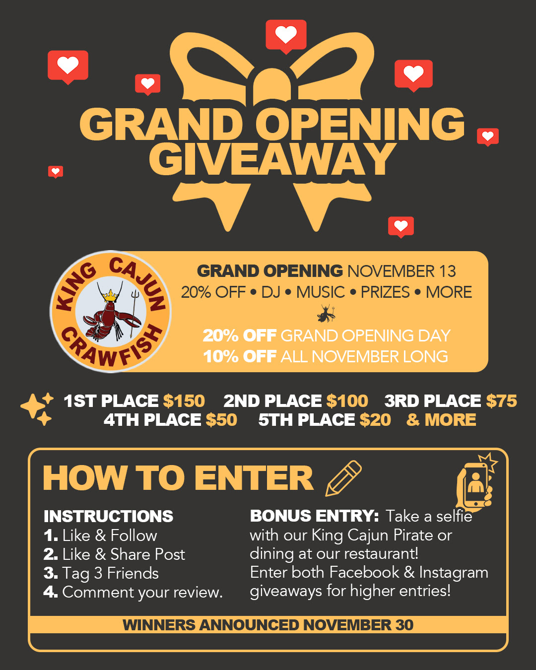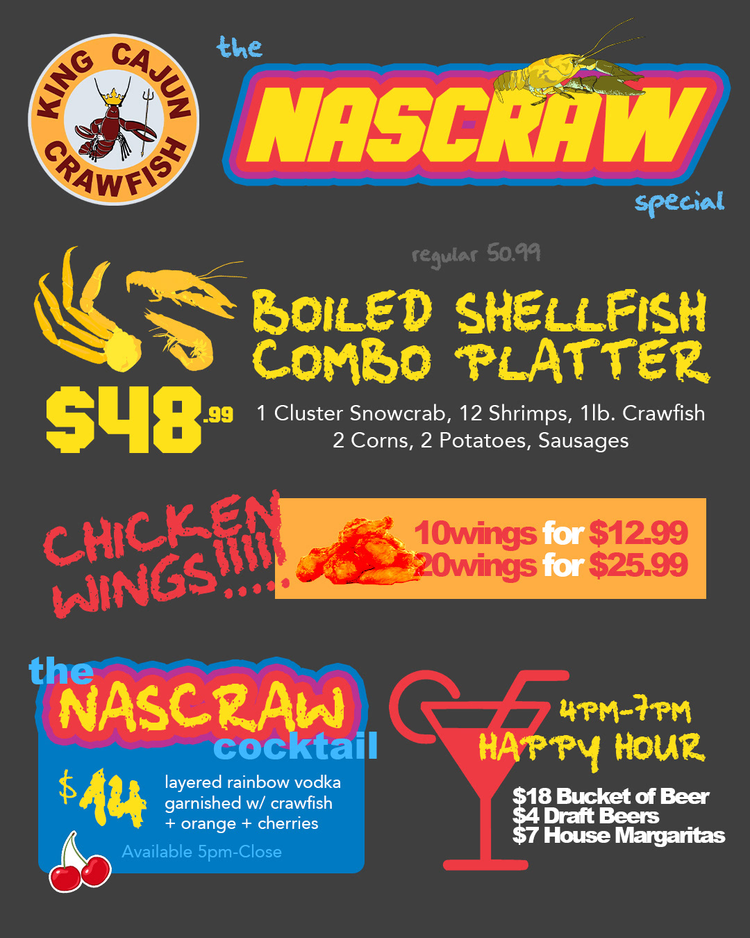 King Cajun Crawfish is a seafood boil franchise that specializes in New Orleans cuisine with a Vietnamese-cajun twist. As a franchise, King Cajun Crawfish graphics required consistent branding through colors, fonts, logos, and messaging throughout all mediums from marketing campaigns, to menus, to storefront displays. I achieved multiple, successful efforts to drive up foot traffic alongside popular events that were happening in the area. By coordinating events like the grand opening, college nights, and the Nascraw, I introduced King Cajun Crawfish to a city of people who have never heard of the brand before.